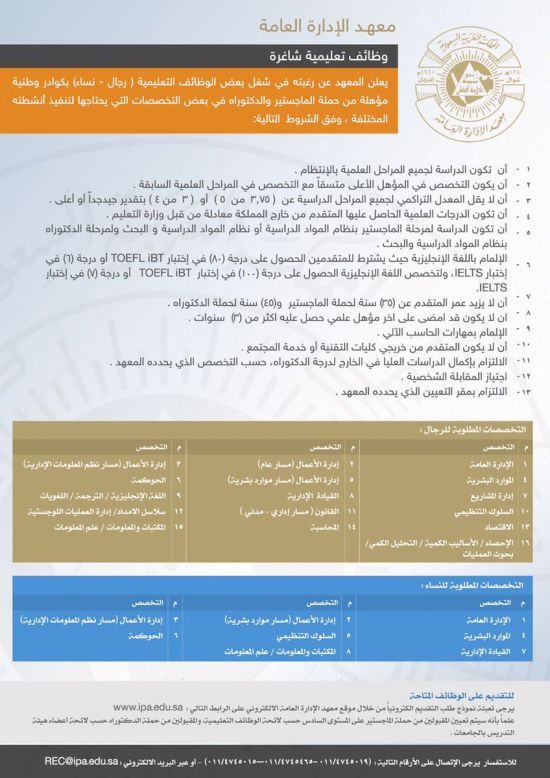 معهد الإدارة وظائف تعليمية رجال ونساء في عهدد من التخصصات لحملة الماجستير والدكتوراة